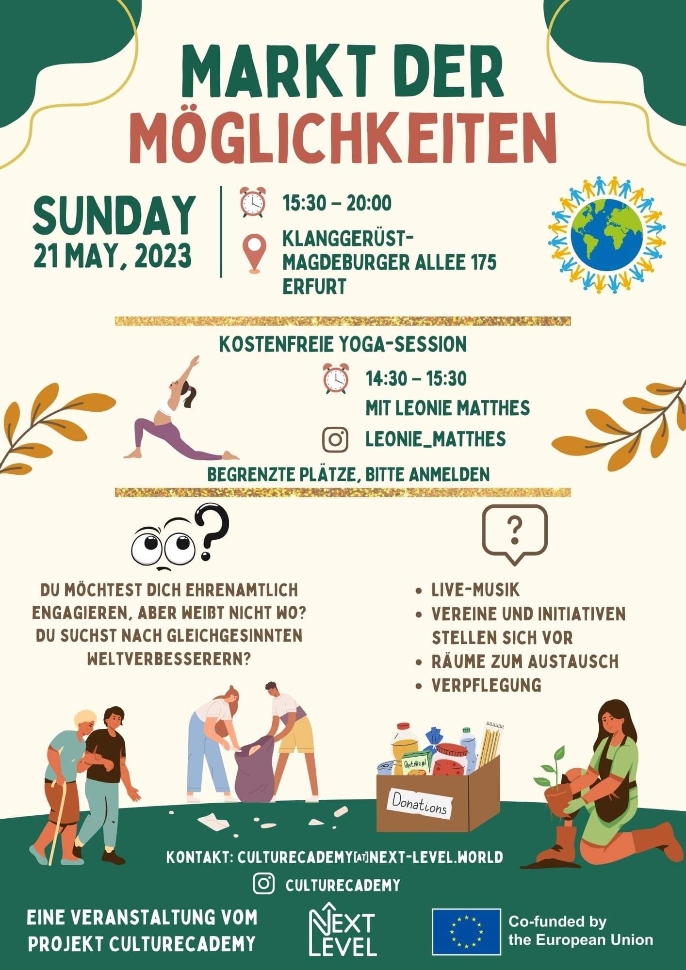im Rahmen des Projektes "Culturecademy", präsentiert werden Möglichkeiten des Engagements; offene Yoga-Stunde (14:30), Musik