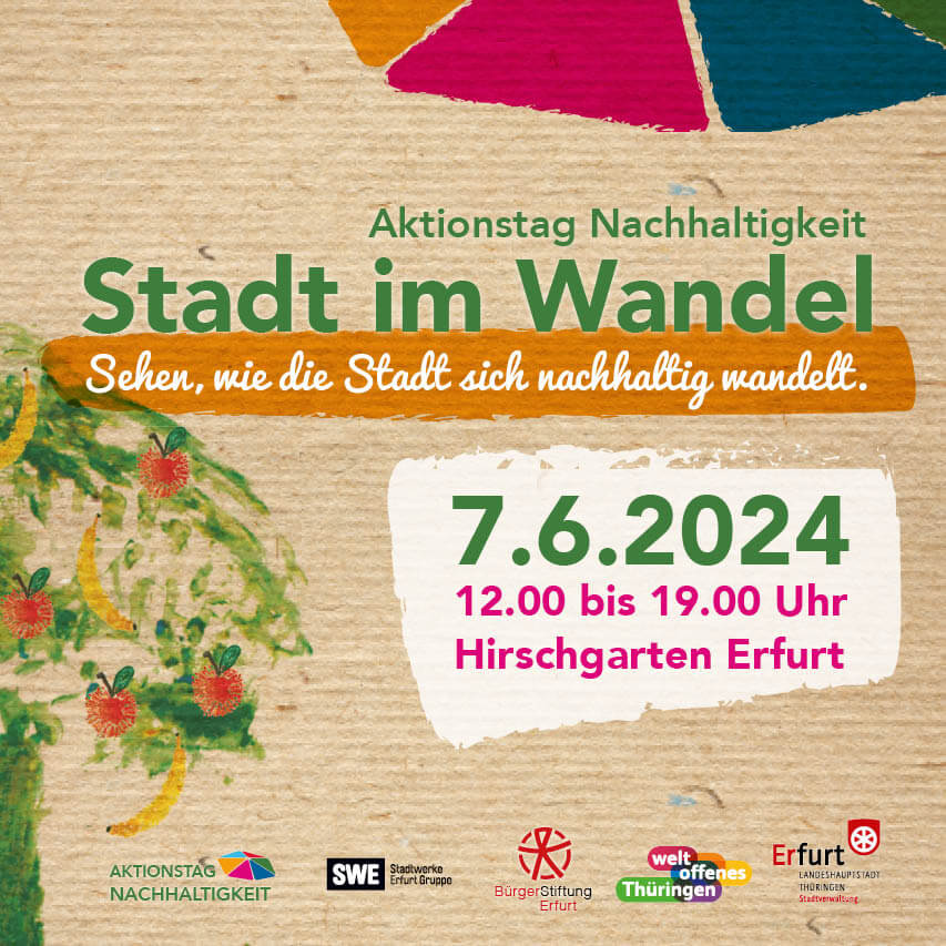 Ein breites Bündnis aus Vereinen, Verbänden und Initiativen stellt gemeinsam mit der Stadtverwaltung Erfurt und der BürgerStiftung Erfurt das Thema Nachhaltigkeit in den Fokus. Es geht allen voran um die nachhaltige Lebensweise der Menschen, die Vorstellung von Zukunftsprojekten und die praktische Umsetzung der weltweit verabschiedeten Nachhaltigkeitsziele, der sogenannten Sustainable Development Goals (SDGs).