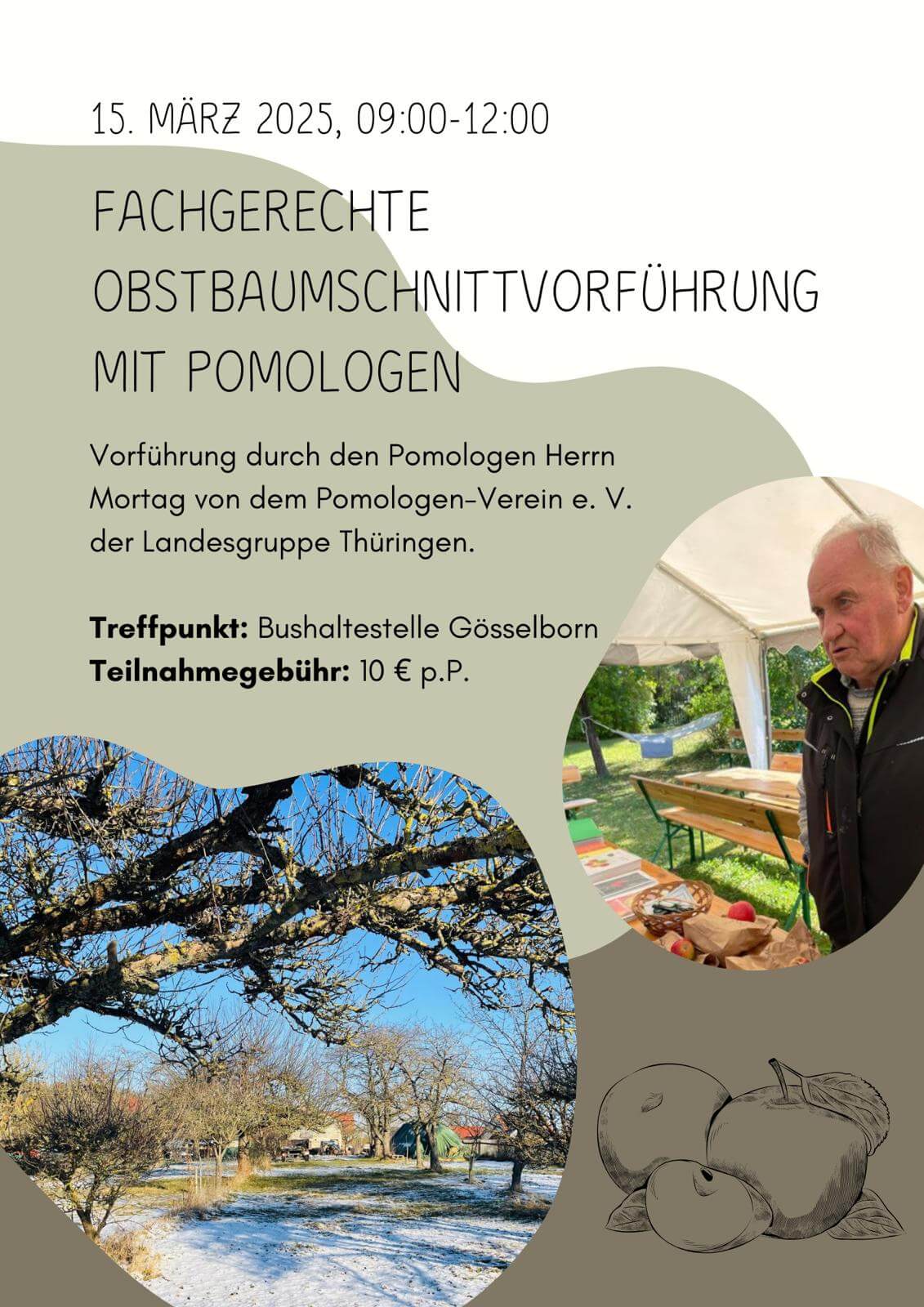 Wissenswertes zum Obstbaumschnitt mit Hans-Jürgen Mortag von der Landesgruppe Thüringen des Pomologen-Vereins e.V.; Gebühr: 10 €, Anmeldung erwünscht
