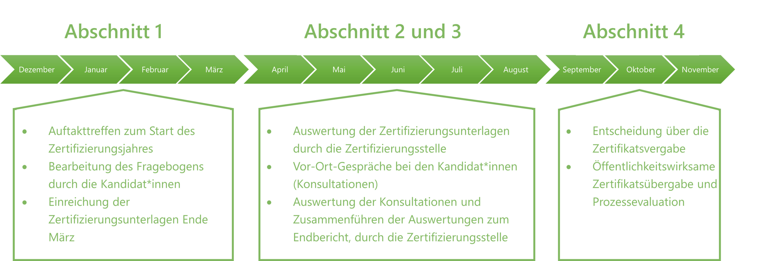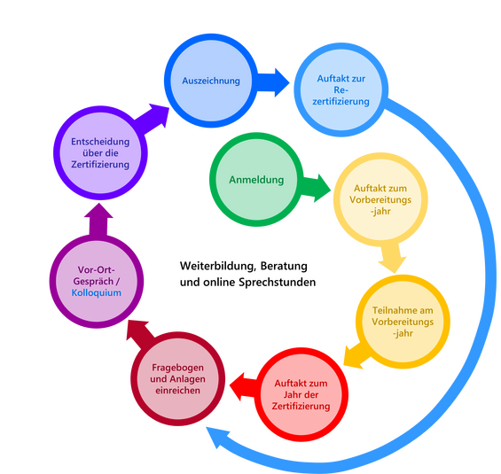 • Die Zertifizierung gliedert sich in mehrere Phasen, wobei das Zertifizierungsjahr aus 4 Abschnitten besteht (Auftakt, Bearbeitung des Fragebogens, Vor-Ort-Konsultation zur Abklärung offener Fragen, feierliche Übergabe der Zertifikate).