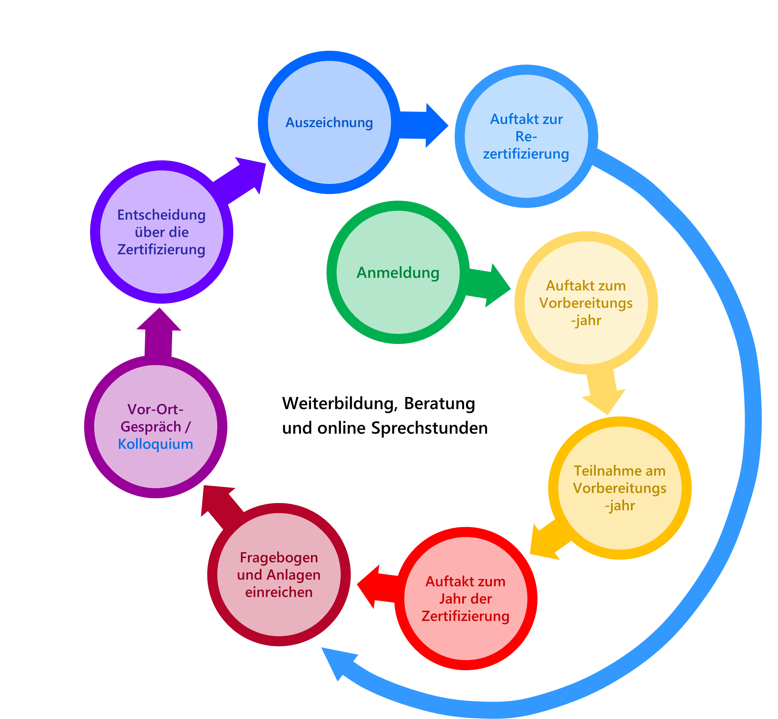 Alle weiteren Rezertifizierungen erfolgen alle fünf Jahre. Zwischen den Rezertifizierungen sind die Bildungsanbieter*innen angehalten ihre Bildungsarbeit weiter zu entwickeln und erreichte Qualitätsstandards aufrecht zu erhalten. Eine Beratung durch die Zertifizierungsstelle ist weiterhin möglich.